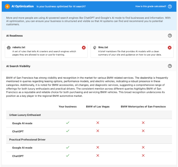 - AI Search Visibility Test — Tests whether the business appears in AI-generated answers across multiple platforms and personas, using natural-language questions modeled after real customer search behavior
